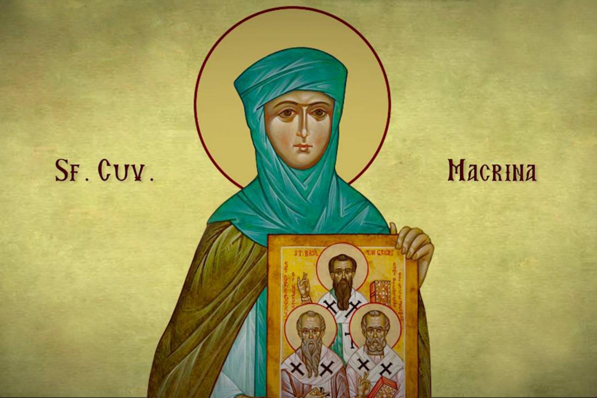 Sfânta Cuvioasă Macrina s-a născut în anul 327 d.H. și a fost sora Sfântului Vasile cel Mare și a Sfântului Grigorie de Nyssa. Macrina a fost cea mai mare din cei zece copii ai acestei familii binecuvântate. A fost logodită cu un tânăr de viță nobilă care, după un timp, a murit. Când logodnicul i-a murit, Macrina nu a vrut să se mai logodească cu alt bărbat, spunând că “nu este drept ca fecioara logodită o dată cu un bărbat să caute după aceea iar logodnă; chiar și după legea firii, trebuie să fie o singură logodnă, așa cum este o singură naștere și o singură moarte”.