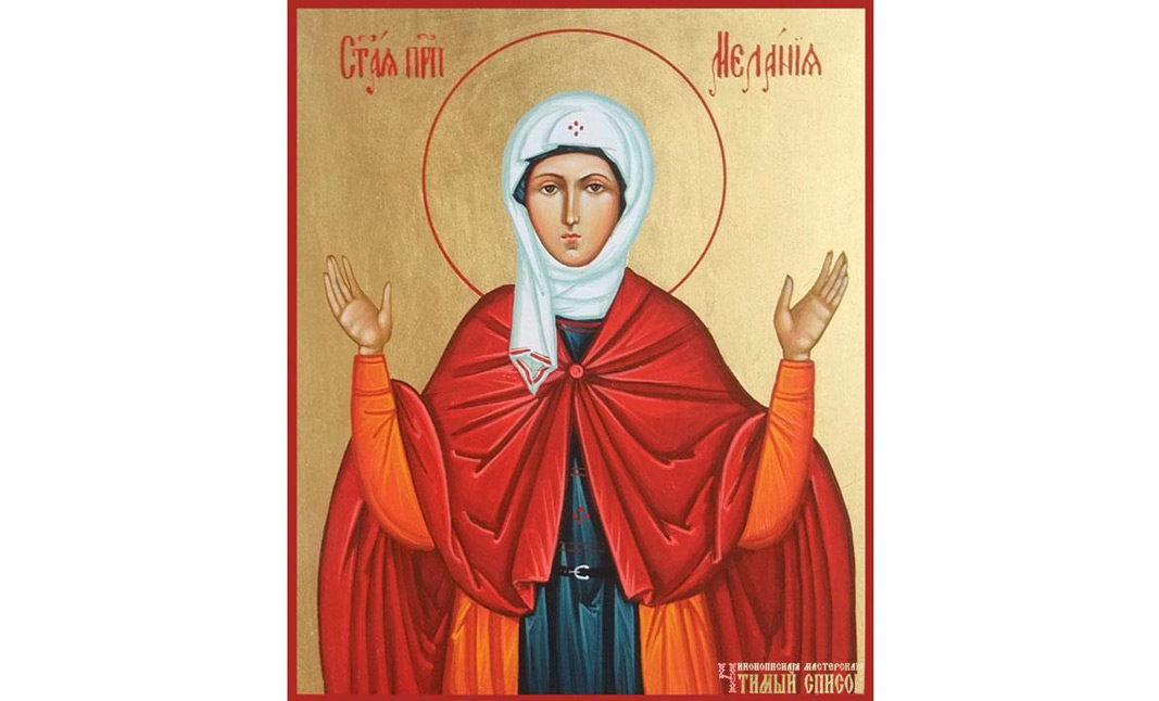 Sfânta Cuvioasă Melania s-a născut la Roma, într-o familie de patricieni, în a doua jumătate a secolului al IV-lea. Părinţii au silit-o să se căsătorească cu un tânăr de viţă nobilă, Alpinian, cu care a avut doi copii. După naşterea celui de-al doilea copil, însă, Melania şi Alpinian s-au hotărât să rămână împreună doar ca frate şi soră, proslăvindu-L pe Hristos.