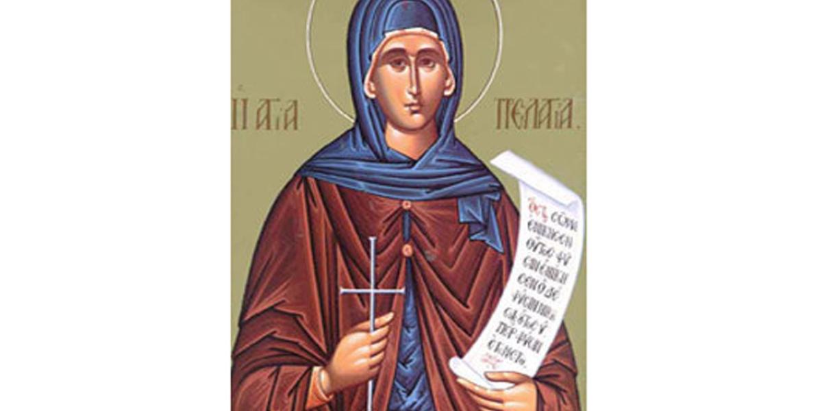 Sfânta Cuvioasă Pelaghia a trăit în secolul al V-lea d.H. Pelaghia a fost înzestrată de Dumnezeu cu o frumuseţe trupească nemaivăzută, iar înainte de a se converti la creştinism se numea “Margareta”. În tinereţe, Margareta şi-a folosit frumuseţea pentru desfrânare. Trecând într-o zi pe lângă biserica în care predica Episcopul Non, frumoasa desfrânată s-a oprit ca să-i asculte cuvântarea. Episcopul, văzând-o pe Margareta, a spus: “Luaţi aminte la femeia aceasta, de la care eu multă învăţătură am aflat. Socotiţi câte ceasuri a zăbovit în camera ei, spălându-se şi îmbrăcându-se cu ales vestmânt şi împodobindu-se în faţa oglinzii cu multă grijă, numai ca să arate mai frumoasă decât celelalte femei, în faţa oamenilor. Iar noi, care dorim din toata inima să fim bineplăcuţi Lui Dumnezeu, ne lenevim şi nu ne silim să împodobim păcătosul nostru suflet, nu ne sârguim să-l spălăm cu lacrimile pocăinţei, nici să-l împodobim cu mărgăritarele faptelor bune, ca să se înfăţişeze cu vestmânt cuviincios în faţa Lui Dumnezeu!”