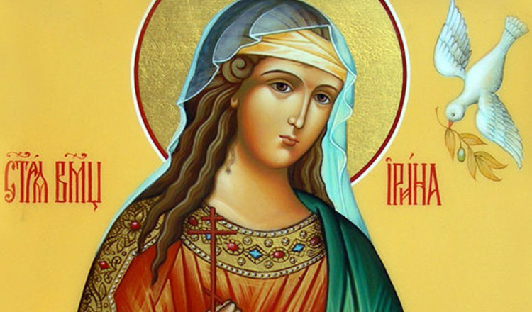 Sfânta Irina este cinstită pe 5 mai. Irina a fost singura fiică a lui Liciniu, rege în cetatea Maghedon. Sfânta Muceniță Irina s-a născut păgână, iar numele ei a fost la început Penelope. Când a împlinit șase ani, tatăl ei a zidit pentru ea, dincolo de cetate, un turn cu multe camere. A fost închisă în acest turn, împreună cu 13 fecioare, o învățătoare cu numele Caria și cu Apelian, un bătrân înțelept.