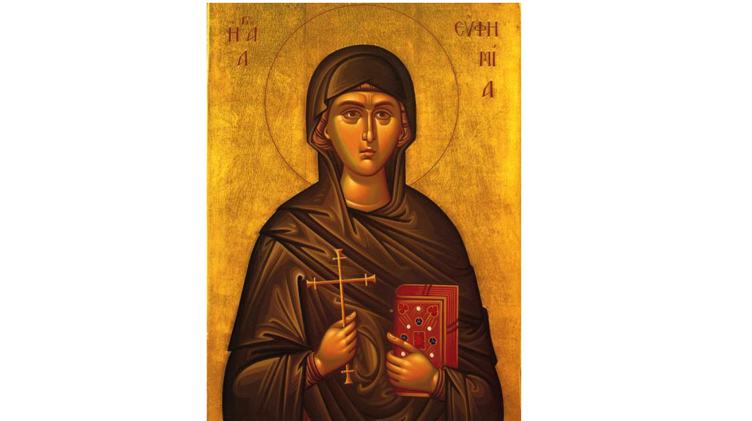 Sfânta Mare Muceniţă Eufimia s-a născut în cetatea Calcedon şi a trăit pe vremea împăratului roman Diocleţian (284-305 d.H.), prigonitorul creştinilor. Tatăl sfintei, senatorul Filofron, şi mama sa, Theodorisia, erau creştini cucernici. Pentru că au refuzat să împlinească porunca proconsulului Pricus de a jertfi idolilor, Eufimia a fost supusă multor torturi. Întrebată fiind de ce a sfidat porunca dată de proconsul, Sfânta Eufimia a răspuns: “Porunca împăratului şi a ta se cuvine să fie împlinită atunci când nu este contrară poruncii Lui Dumnezeu. Dar dacă ea este potrivnică poruncii Lui Dumnezeu, atunci ea nu numai că nu trebuie împlinită, dar trebuie şi combătută”. Mărturisitoarea a fost aruncată într-un cuptor încins, apoi într-o apă plină cu reptile şi şerpi otrăvitori, dar, însemnându-se cu semnul sfintei cruci, a scăpat de fiecare dată nevătămată. Mai apoi, Eufimia şi-a dat duhul în mânile Lui Dumnezeu, după ce a fost aruncată fiarelor sălbatice.