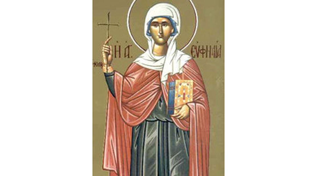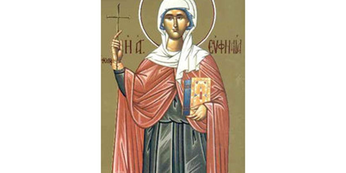Sfânta Mare Muceniţă Eufimia s-a născut în cetatea Calcedon şi a trăit pe vremea împăratului roman Diocleţian (284-305 d.H.), prigonitorul creştinilor. Tatăl sfintei, senatorul Filofron, şi mama sa, Theodorisia, erau creştini cucernici. Pentru că refuzat să împlinească porunca proconsulului Pricus de a jertfi idolilor, Eufimia a fost supusă multor torturi. Întrebată fiind de ce a sfidat porunca dată de proconsul, Sfânta Eufimia a răspuns: “Porunca împăratului şi a ta se cuvine să fie împlinită atunci când nu este contrară poruncii Lui Dumnezeu. Dar dacă ea este potrivnică poruncii Lui Dumnezeu, atunci ea nu numai că nu trebuie împlinită, dar trebuie şi combătută”. Mărturisitoarea a fost aruncată într-un cuptor încins, apoi într-o apă plină cu reptile şi şerpi otrăvitori, dar, însemnându-se cu semnul sfintei cruci, a scăpat de fiecare dată nevătămată. Mai apoi, Eufimia şi-a dat duhul în mânile Lui Dumnezeu, după ce a fost aruncată fiarelor sălbatice.