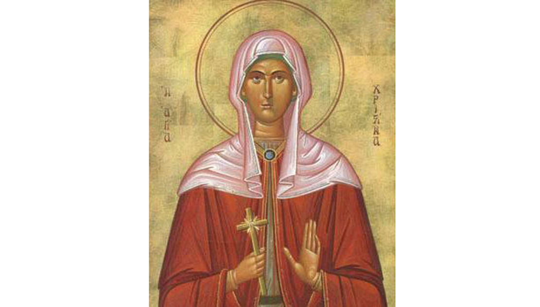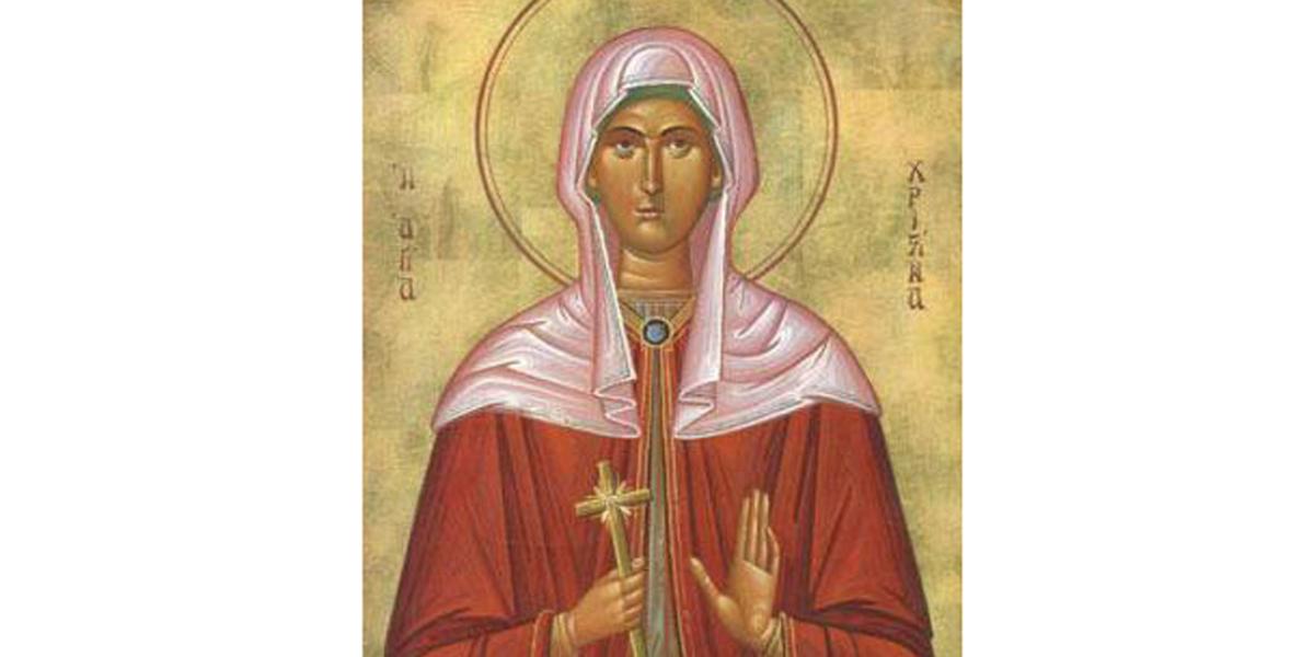 Sfânta Mare Muceniţă Hristina s-a născut în cetatea Tir din Fenicia antică şi a trăit pe vremea împăratului roman Septimiu Sever (193-211 d.H.). A fost fiica dregătorului imperial Urban, mai-marele cetăţii.