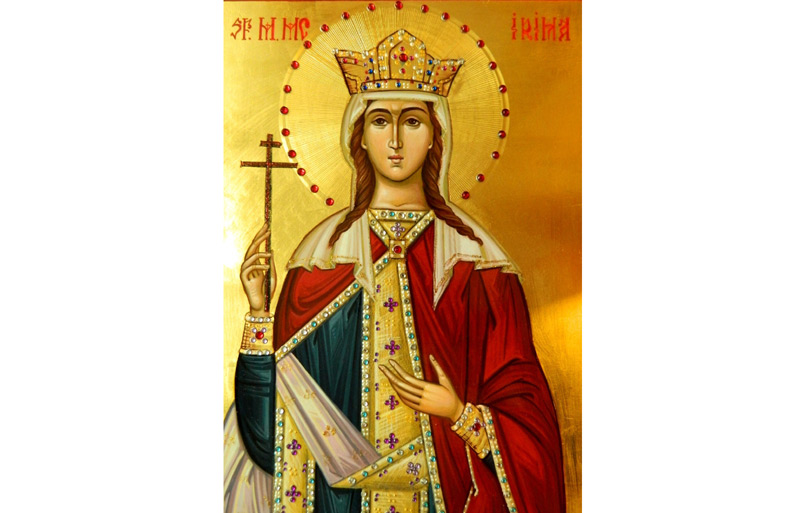 Irina a aflat despre Hristos de la înţeleptul Apelian şi a primit botezul de la Timotei, ucenicul Sfântului Apostol Pavel. Înfuriat, tatăl ei a vrut să o supună la torturi, dar Irina l-a convertit şi pe el la creştinism. Tânăra a fost torturată în vremea a patru împăraţi. Regele Sedechia a îngropat-o până la gât într-o groapă cu şerpi şi cu scorpioni, dar îngerul Domnului a păzit-o neatinsă. Regele a încercat apoi să o taie cu fierăstrăul, dar acesta s-a frânt de trupul ei ca şi când trupul ar fi fost de marmură. Acelaşi rege a legat-o de o roată de moară şi a dat drumul şuvoiului, nădăjduind că se va îneca. Dar fecioara a scăpat nevătămată.