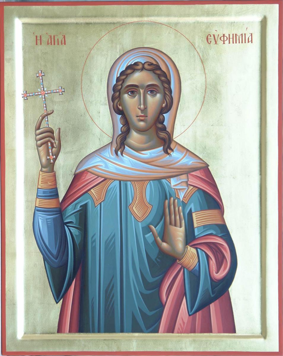 Sfânta Mare Muceniță Eufimia s-a născut în cetatea Calcedon și a trăit în timpul împăratului păgân Dioclețian (284-305 d.H.), prigonitorul creștinilor. Tatăl ei, senatorul Filofron, și mama sa, Theodorisia, erau creștini. Pentru că a refuzat să împlinească porunca proconsulului Pricus și să aducă jertfe idolilor, Eufimia a fost supusă la multe torturi. Întrebată de ce a sfidat porunca proconsulului, Eufimia i-a răspuns acestuia: “Porunca împăratului și a ta se cuvine să fie împlinită atunci când nu este contrară poruncii Lui Dumnezeu. Dar dacă ea este potrivnică poruncii Lui Dumnezeu, atunci ea nu numai că nu trebuie împlinită, dar trebuie și combătută!”