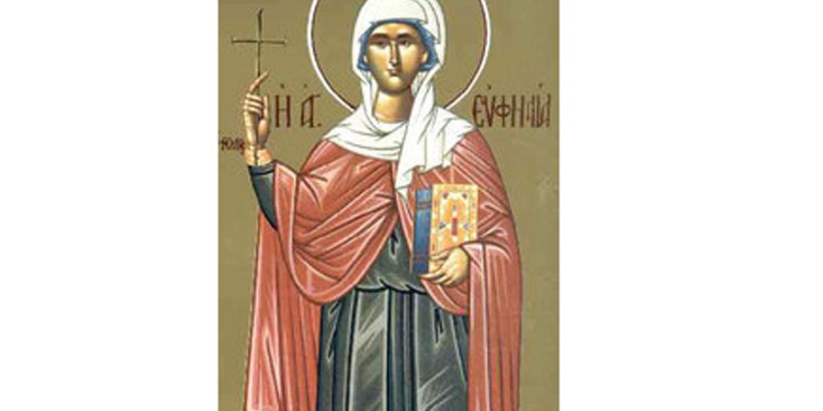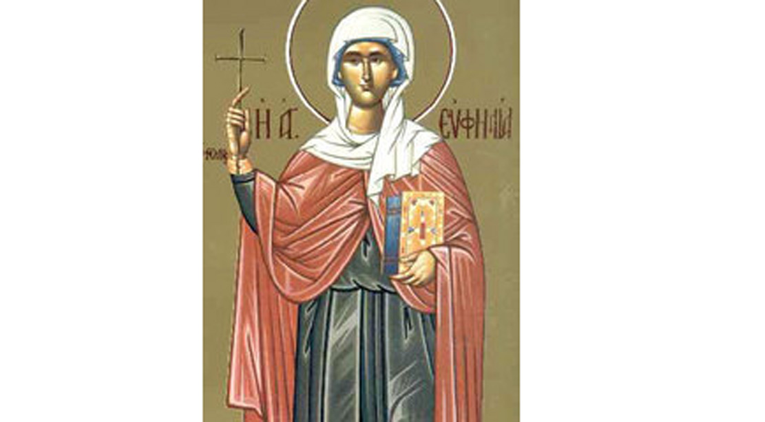 Sfanta Eufimia s-a nascut in Calcedon si a trait in vremea imparatului Diocletian (284-305). Tatal ei, senatorul Filofron si mama sa, Theodorisia, erau crestini. Pentru ca refuzat sa implineasca porunca proconsului Pricus de a aduce jertfe idolilor, a fost supusa la multe chinuri. Cand a fost intrebata de ce a sfidat porunca data de proconsul, Sfanta Eufimia a raspuns: “Comanda imparatului si a ta se cuvine sa fie implinita atunci cand nu este contrara poruncii lui Dumnezeu. Dar daca ea este potrivnica poruncii lui Dumnezeu, atunci ea nu numai ca nu trebuie implinita, dar trebuie si combatuta”. A fost aruncata intr-un cuptor incins, intr-o apa plina de taratoare otravitoare, dar insemnandu-se cu semnul sfintei cruci, a iesit nevatamata. Si-a dat sufletul cand a fost aruncata la fiarele salbatice.