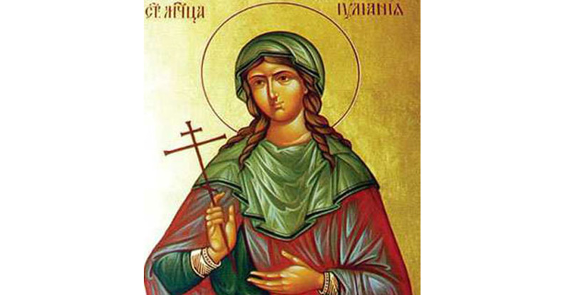Sfânta Muceniţă Iuliana a trăit şi a pătimit pentru Domnul Iisus Hristos la sfârşitul secolului al III-lea - începutul secolului al IV-lea d.H. A fost fiica unor cetăţeni romani bogaţi, de neam ales, care au logodit-o cu Eleusie, senator păgân.