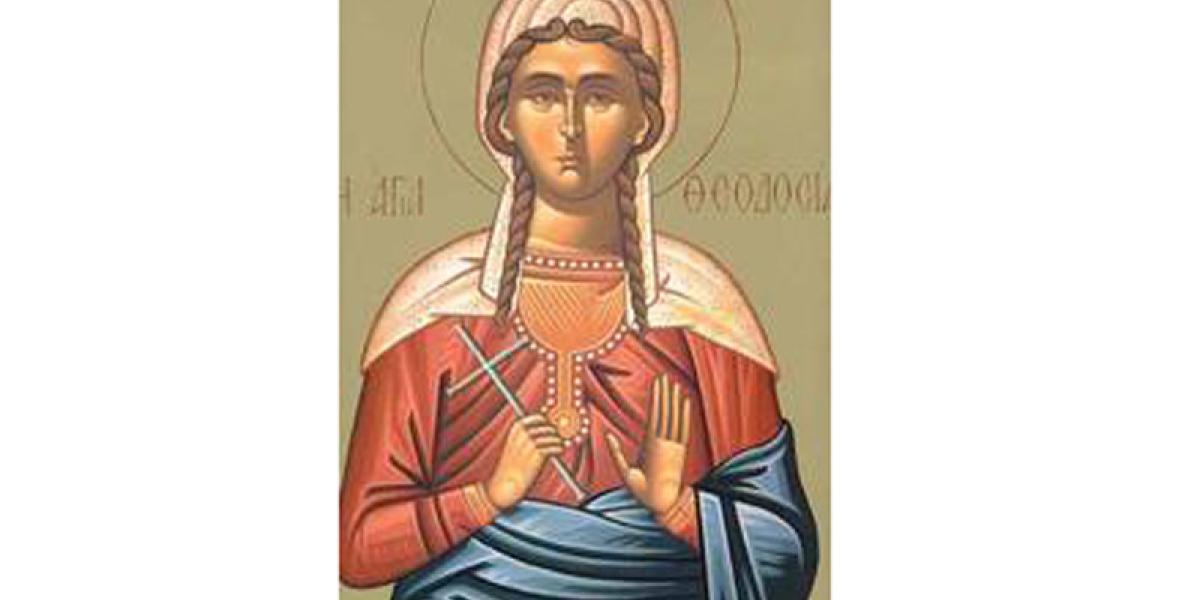 Sfânta Teodosia a fost originară din Tir (Fenicia). Potrivit lui Evsevie, episcopul Cezareei Palestinei, martor ocular, Sfânta Teodosia s-a apropiat de creştinii închişi în temniţă pentru că nu mai jertfeau idolilor şi i-a întărit în mucenicia lor. Din această cauză, sfânta a fost dusă de soldaţii care păzeau temniţa înaintea judecătorului. Acesta auzind cele întâmplate, a poruncit să i se lege o piatră de gât şi să fie aruncată în mare. Prin purtarea de grijă a lui Dumnezeu, îngerii au adus-o la mal nevătămată.
