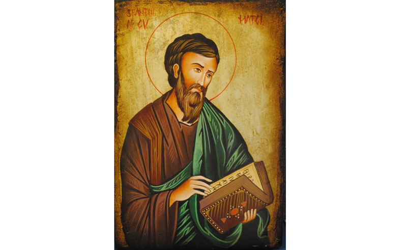 Potrivit Tradiţiei creştine, Sfântul Apostol Matei este autorul primei Evanghelii din Noul Testament. Istoricul Eusebiu şi Sfântul Epifanie mărturisesc că Matei a scris Evanghelia sa în limba aramaică, vorbită pe vremea Lui Hristos, precum şi în limba greacă. Din Martirologiul roman aflăm că Matei a murit ca martir în Etiopia, fiind ars pe rug de păgâni, însă din textele apocrife ce vorbesc despre trecerea sa la cele veşnice, aflăm că a suferit moarte de martir în Pont.