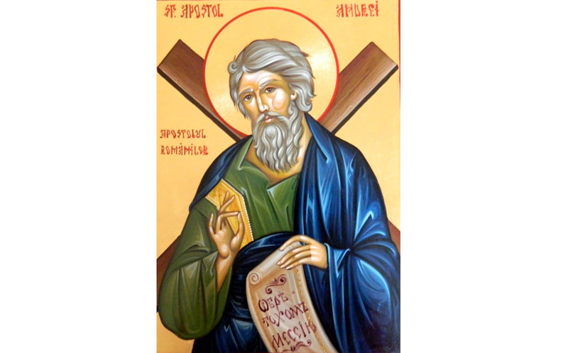 După ce le-a vestit multor neamuri păgâne Evanghelia Domnului, Sfântul Apostol Andrei a fost martirizat la Patras, în Grecia. Nu se cunoaşte cu exactitate anul morţii sale, dar se presupune că a fost în timpul persecuţiilor declanşate de sângerosul împărat roman Nero (54-68 d.H.) sau Domiţian (81-96 d.H.). Potrivit tradiţiei, Sfântul Andrei a fost răstignit pe o cruce în formă de “X”. De aceea, el este zugrăvit în icoane lângă de o cruce în formă de X.