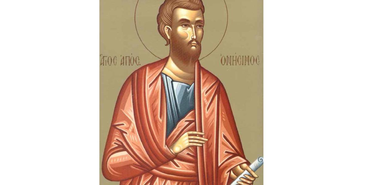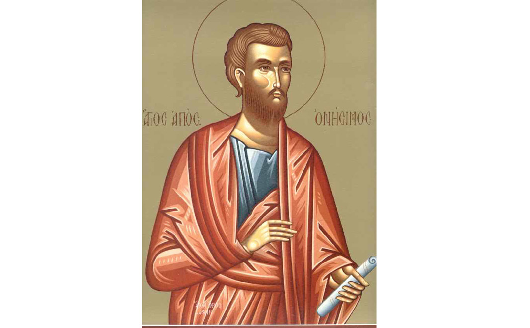 Sfântul Apostol şi Mucenic Onisim a fost unul din cei 70 de Apostoli ai Mântuitorului Iisus Hristos, trimişi la propovăduire. În tinereţe, Onisim a fost rob al lui Filimon, un creştin înstărit din cetatea Colose. Greşindu-i stăpânului, Onisim a fugit la Roma, unde a fost întemniţat alături de Sfântul Apostol Pavel. De la Pavel, “Apostolul neamurilor”, a auzit pentru prima dată Onisim Evanghelia mântuirii şi tot de la el a primit Sfântul Botez. Sfântul Apostol Pavel fusese cel care îl adusese, mai înainte, pe Filimon la dreapta-credinţă, astfel că a mijlocit împăcarea între acesta şi robul Onisim. Ne stă mărturie epistola Sfântului Apostol Pavel către Filimon, care constituie cea mai scurtă carte cuprinsă în Sfânta Scriptură. În urma acestei epistole, Filimon l-a primit pe Onisim ca pe un frate, eliberandu-l apoi din robie.