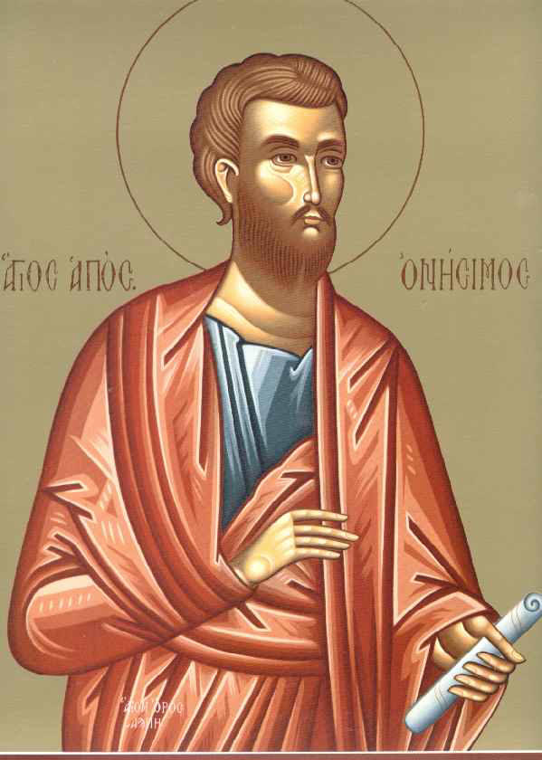 Sfântul Apostol şi Mucenic Onisim a fost unul din cei 70 de Apostoli ai Mântuitorului Iisus Hristos trimişi la propovăduire. În tinereţe, Onisim a fost rob al lui Filimon, un creştin înstărit din cetatea Colose. Greşindu-i stăpânului, Onisim a fugit la Roma, unde a fost întemniţat alături de Sfântul Apostol Pavel. De la Pavel, “Apostolul neamurilor”, a auzit pentru prima dată Onisim Evanghelia mântuirii şi tot de la el a primit Sfântul Botez. Sfântul Apostol Pavel fusese cel care îl adusese, mai înainte, pe Filimon la dreapta-credinţă, astfel că a mijlocit împăcarea între acesta şi robul Onisim. Ne stă mărturie epistola Sfântului Apostol Pavel către Filimon, care constituie cea mai scurtă carte cuprinsă în Sfânta Scriptură. În urma acestei epistole, Filimon l-a primit pe Onisim ca pe un frate, eliberandu-l apoi din robie.