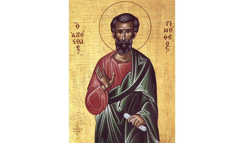 Sfântul Apostol Timotei era originar din cetatea Listra şi vrednic ucenic al Sfântului Apostol Pavel. Timotei s-a născut din tată păgân elin şi din mamă de neam evreu. Din Faptele Apostolilor (Noul Testament) aflăm că, la un moment dat, Sfântul Apostol Pavel a ajuns împreună cu Apostolul Barnaba în cetatea Listrei, unde a tămăduit un şchiop din pântecele maicii sale. În urma acestei minuni, mama lui Timotei l-a găzduit în casa sa şi i-a dăruit fiul Apostolului Pavel, ca dar pentru binecuvântarea adusă în cetate.