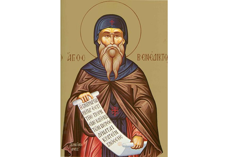 Sfântul Benedict s-a născut în Nursia, o provincie a Italiei, în anul 480 după Hristos, din părinţi slăviţi şi binecuvântaţi cu multe bogăţii. A primit tunderea în monahism de la monahul Roman; mai apoi, s-a retras într-un munte stâncos, vieţuind într-o peşteră timp de peste trei ani. Sfântul Benedict din Nursia avea duhul înainte-vederii, al vindecărilor, al scoaterii demonilor şi al învierii morţilor; el li se înfăţişa unora la mari distanţe în faţă (aievea), iar altora le apărea în vis. Odată, Sfântul Benedict a văzut cu duhul că paharul cu vin care i se pusese înainte este otrăvit. Când l-a însemnat, deasupra, cu semnul sfintei cruci, paharul s-a spart în bucăţi.