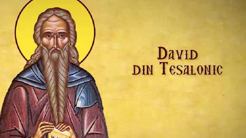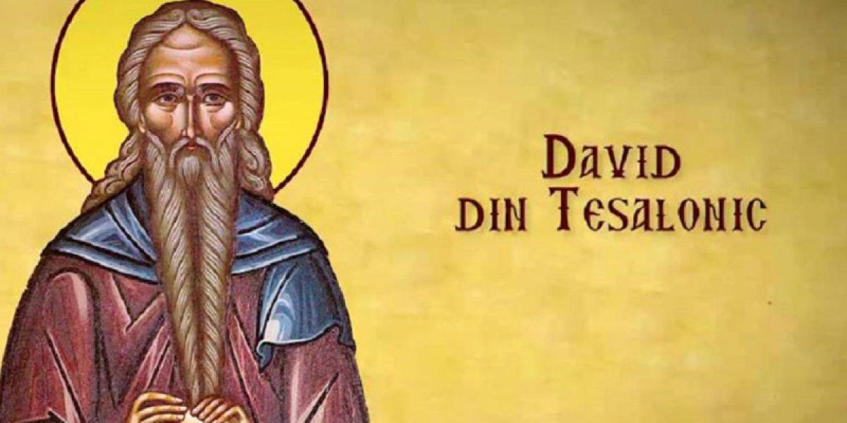 Sfântul Cuvios David s-a născut în Tesalonic şi a trăit în secolul al VI lea. Sfântul Cuvios David s-a călugărit de tânăr în Mănăstirea “Sfinţilor Mucenici Teodor şi Mercurie”. După un timp şi-a făcut din creanga unui migdal loc de pustnicie. Aici va îndura ploile, zăpezile, căldura şi alte strâmtorări cu multă răbdare timp de trei ani, până când îngerul Domnului îi va cere să se nevoiască într-o chilie. Pentru viaţa sa curată a primit darul de a izgoni pe diavoli şi de a vindeca pe bolnavi.