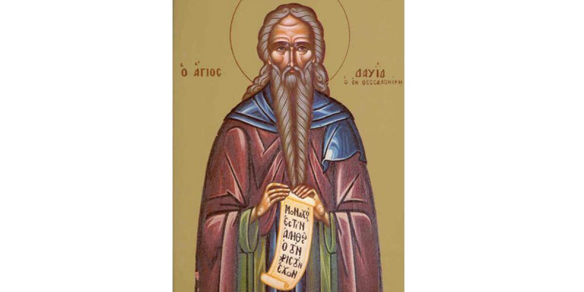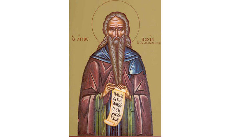 Sfântul Cuvios David s-a născut în cetatea Tesalonicului şi a trăit în secolul al VI-lea d.H. Plin de râvnă pentru Hristos. David s-a călugărit de tânăr şi a intrat în Mănăstirea “Sfinţilor Mucenici Teodor şi Mercurie”. După un timp, Cuviosul David şi-a făcut loc de pustnicie din creanga unui migdal. Acolo a îndurat ploile, zăpezile, căldura şi alte strâmtorări, cu multă răbdare, preţ de trei ani, până când îngerul Domnului i-a cerut să se nevoiască într-o chilie. Pentru viaţa sa îmbunătăţită, Cuviosul David a primit darul de a izgoni diavolii şi de a-i tămădui pe cei bolnavi.