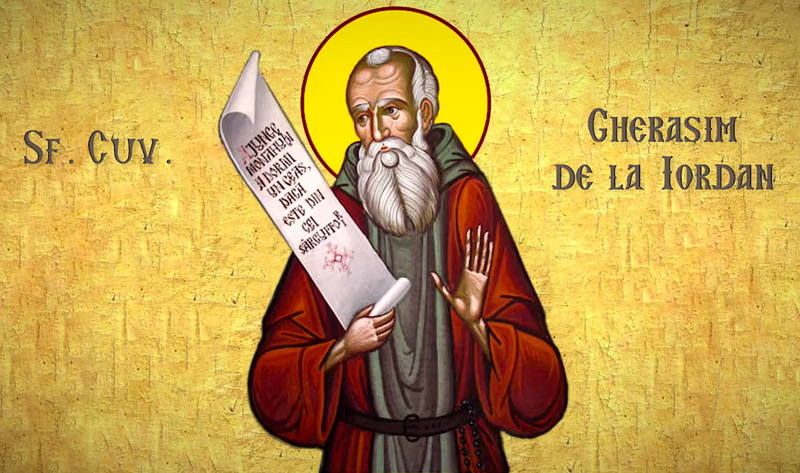 Sfântul Gherasim a trăit în sec. al VII-lea. După ce s-a călugărit, s-a retras în pustiul Tebaidei, unde a întemeiat un aşezământ monahal ce a durat până în zilele noastre. Gherasim era aşa de credincios, încât până şi fiarele sălbatice i se supuneau. Într-o zi, pe când mergea prin pustia Iordanului, a întâlnit un leu care răgea cumplit din cauză că-i intrase un spin în labă. Gherasim i-a scos spinul şi, din acel moment, animalul l-a urmat pretudindeni, ca un ucenic.
