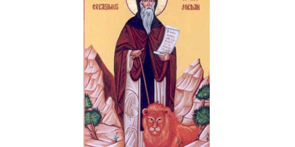 Sfântul Gherasim a trăit în sec. al VII-lea. După ce s-a călugărit, s-a retras în pustiul Tebaidei, unde a întemeiat un aşezământ monahal ce a durat până în zilele noastre. Gherasim era aşa de credincios, încât până şi fiarele sălbatice i se supuneau. Într-o zi, pe când mergea prin pustia Iordanului, a întâlnit un leu care răgea cumplit din cauză că-i intrase un spin în labă. Gherasim i-a scos spinul şi, din acel moment, animalul l-a urmat pretudindeni, ca un ucenic.