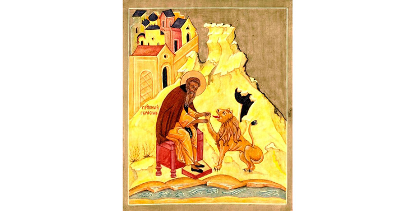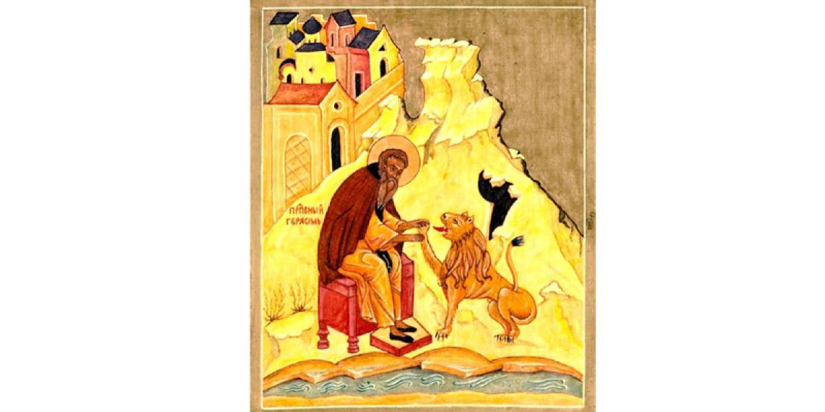 Sfântul Gherasim a trăit în sec. al VII-lea. După ce s-a călugărit, s-a retras în pustiul Tebaidei, unde a întemeiat un aşezământ monahal ce a durat până în zilele noastre. Gherasim era aşa de credincios, încât până şi fiarele sălbatice i se supuneau. Într-o zi, pe când mergea prin pustia Iordanului, a întâlnit un leu care răgea cumplit din cauză că-i intrase un spin în labă. Gherasim i-a scos spinul şi, din acel moment, animalul l-a urmat pretudindeni, ca un ucenic.