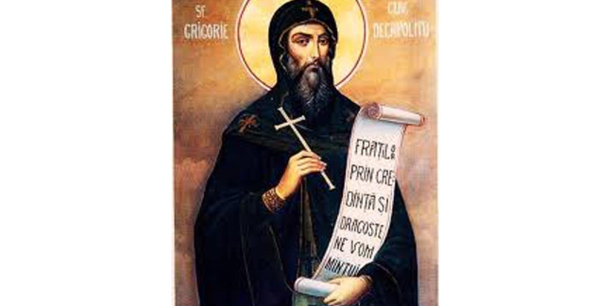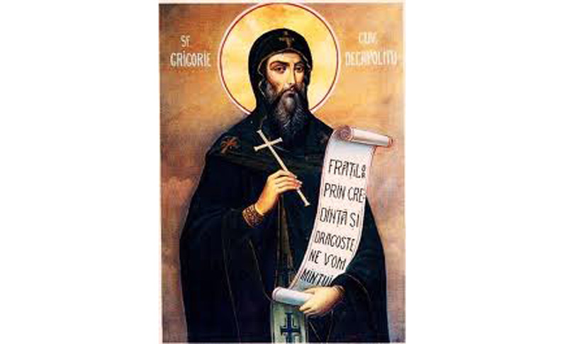 Sfantul Grigorie Decapolitul s-a nascut nascut in orasul Irinopolis din Decapolea Isauriei, in sud-estul Asiei Mici, in jurul anilor 780-790. Ajunge la o manastire din Decapole, la egumenul Simeon, un frate al mamei sale. Aici a ramas timp de 14 ani. Se va retrage intr-o pestera, unde va auzi o chemare de la Dumnezeu - care l-a indemnat sa paraseasca pestera ca sa poata fi de folos si altora. Petrece o iarna intr-o manastire din Efes, ajunge in orasul Proconez, apoi la Enos, in Macedonia. De aici va fi prezent in Tesalonic, unde este gazduit intr-o manastire de catre egumenul Marcu. Impreuna cu un calugar de aici, se indreapta spre Roma. Au mers pe uscat pana la Corint, in sudul Greciei. Se imbarca pe o corabie si ajunge la Roma. Avea o putere deosebita asupra demonilor. Multe persoane stapanite de duhuri necurate au fost vindecate in urma rugaciunilor cuviosului Grigorie.