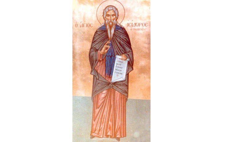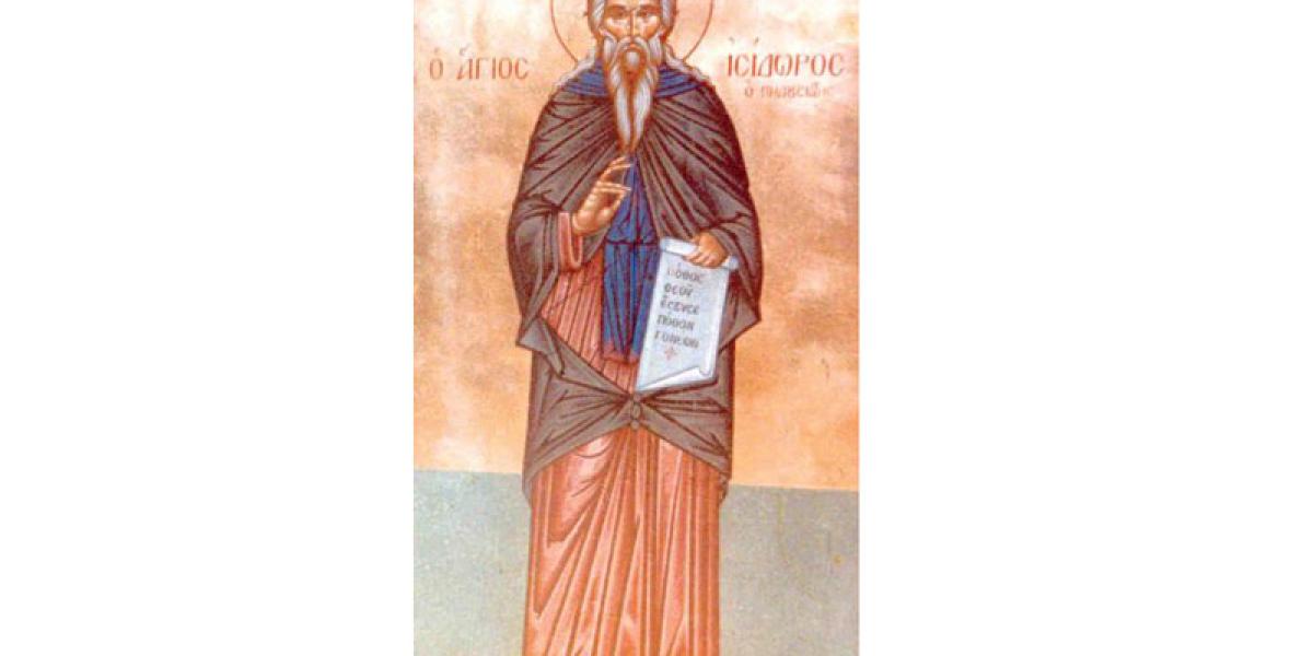 Născut în anul 360 d.H., Sfântul Isidor Pelusiotul este unul dintre sfinţii care s-au nevoit în Egipt. Rudă cu arhiepiscopul Teofil şi cu Chiril al Alexandriei, Isodor a devenit monah de tânăr, vieţuind pe Muntele Pelusion, în vremea împăratului Teodosie cel Mic. Istoricii bisericeşti mărturisesc despre viaţa sfântă şi înţelepciunea cu care a fost dăruit Isidor. De la el ne-au rămas multe cuvinte folositoare, îndeosebi sub forma scrisorilor.