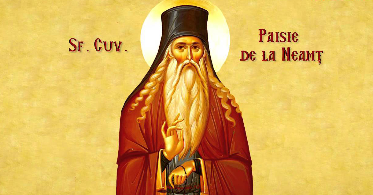 Cuviosul Paisie de la Neamţ este unul din marii înnoitori ai monahismului românesc din veacul al XVIII-lea. Cunoscut şi sub numele de Paisie Velicicovski, cuviosul s-a născut la 21 decembrie 1722, fiu al protopopului Ioan din Poltava, primind la botez numele “Petru”. Hotărât să se călugărească, Petru a purces la Mănăstirile Liubeţk şi Medvedovschi, dar, nemulţumit, a ajuns în Lavra Pecerska din marele oraş Kiev, unde a devenit rasofor. Mai apoi, împreună cu Alexie, Paisie s-a decis să plece în Ţările Române.