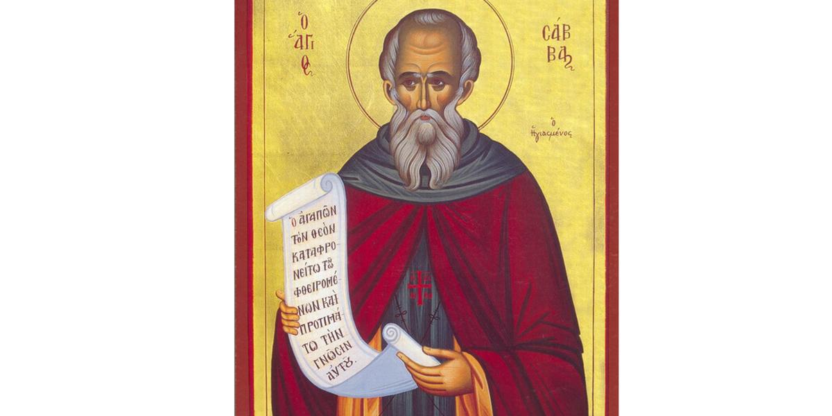 Sfântul Sava cel Sfinţit a văzut lumina zilei pe vremea împăratului Teodosie cel Mic (403-450 d.H.). Originar din provincia Capadocia, Sava era fiul lui Ioan şi al Sofiei. La vârsta de 18 ani, l-a cunoscut pe monahul Eftimie, care l-a trimis la Cuviosul Teoctist, pentru a se desăvârşi în credinţă. Plin de râvnă, Cuviosul Sava a săvârşit multe minuni. Se spune că, prin rugăciunile sale, a izvorat apă în locuri sterpe.