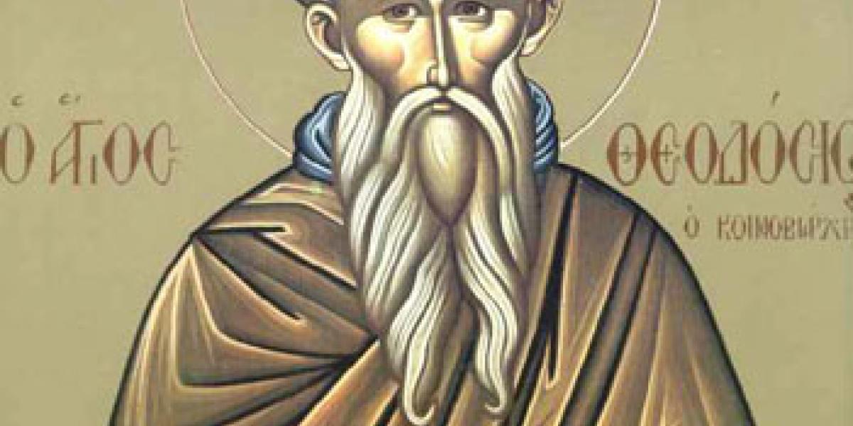 Sfântul Cuvios Teodosie, numit “cel Mare” - pentru faptele sale săvârşite întru propăşirea credinţei - a trăit în perioada secolelor V-VI d.H. S-a născut în satul Mogarisos din ţinutul Capadociei romane (în estul Turciei de astăzi). Tatăl său se numea Proeresie şi mama sa Evloghia şi amândoi erau credincioşi şi cucernici înaintea oamenilor şi a Lui Dumnezeu. Teodosie a îmbrăţişat de tânăr monahismul, mergând la o mănăstire din Oraşul sfânt, Ierusalim.