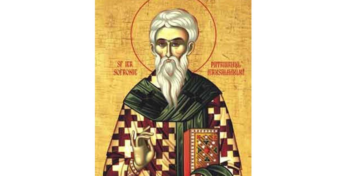 Sfântul Sofronie s-a născut la Damasc (Siria), în jurul anului 550 d.H. În anul 570, călătorind în Palestina pentru a se închina la Locurile Sfinte, Sofronie a intrat în Mănăstirea Sfântului Teodosie cel Mare, situată în vecinătatea Ierusalimului, devenind ucenic al monahului Ioan Moshu. Împreună cu învăţătorul său, Sofronie a purces pe la toate mănăstirile şi călugării din vechiul Egipt, fiind, totodată, apărători ai credinţei ortodoxe împotriva ereziei noi ce tulbura viaţa Bisericii, monotelismul (adepţii acesteia susţineau că în Hristos există o singură lucrare).