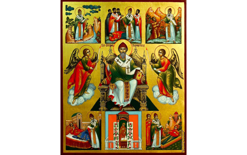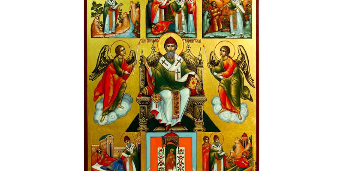 Sfântul Ierarh Spiridon a trăit în secolul al IV-lea de la Hristos. S-a născut în jurul anului 270 d.H., în localitatea Aski din Cipru şi a fost păstor de oi. După moartea soţiei, Sfântul Spiridon a ales să ducă o viaţă de ascet, ajungând, mai târziu, Episcopul Trimitundei, cetate situată în vecinătatea Pafosului. Sfântul Spiridon a participat la primul Sinod ecumenic de la Niceea, din anul 325 d.H.