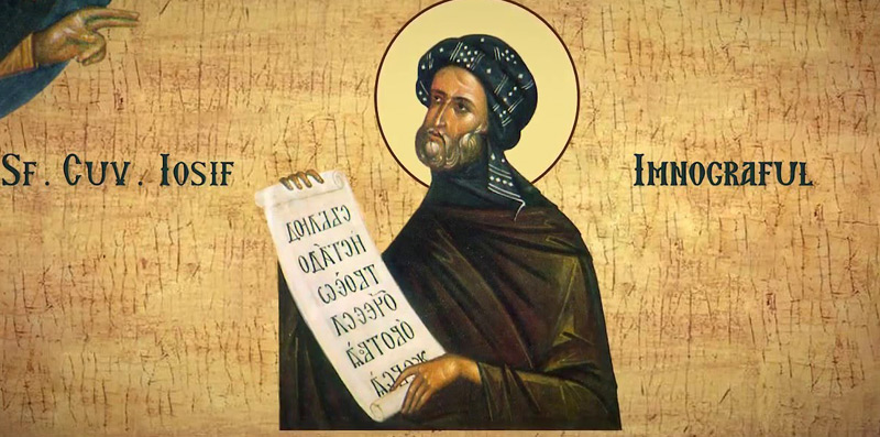Iosif s-a simţit ridicat în văzduh şi s-a trezit înaintea porţilor cetăţii Constantinopol, şi toţi s-au bucurat la vederea lui. Sfântul Iosif a alcătuit canoane şi imne pentru slujbele multor sfinţi. Avea darul înaintevederii, drept pentru care Patriarhul Fotie l-a rânduit duhovnic al cinului preoţesc, ca pe un “om al Lui Dumnezeu, un înger în trup şi un părinte al părinţilor”. Sfântul Iosif imnograful s-a mutat la Domnul la adânci bătrâneţe, în ajunul Sfintei şi Marii Zi Joi, la anul 883 după Hristos.