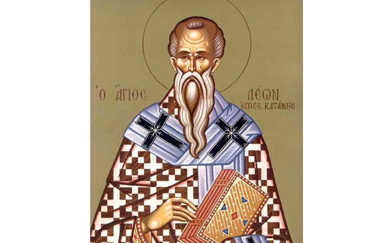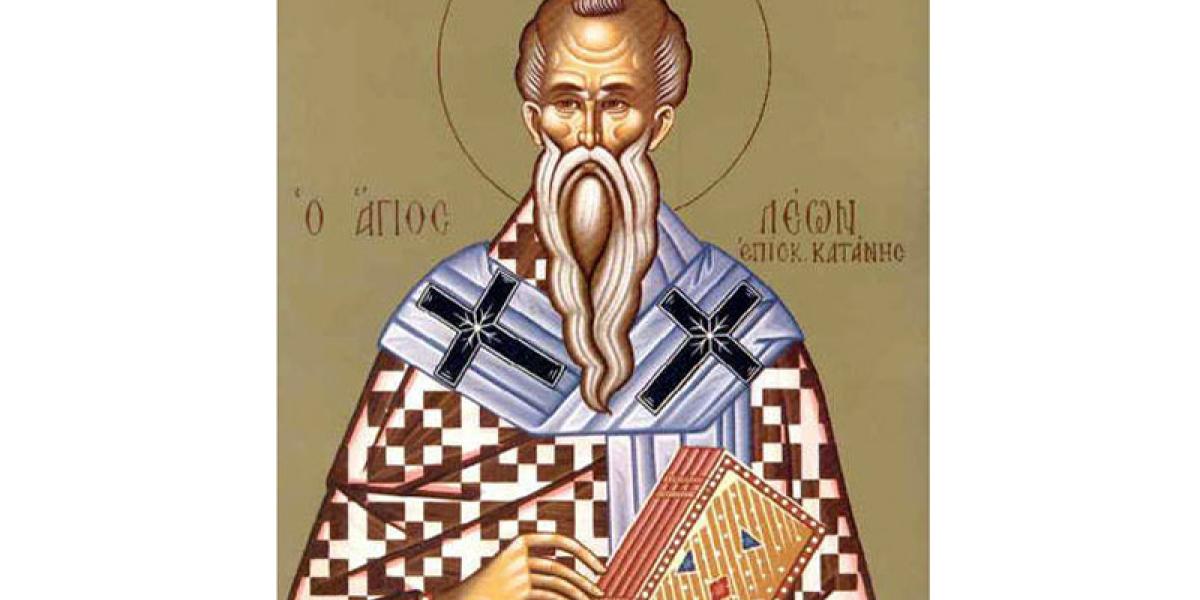 Sfântul Leon, Episcopul Cataniei, a trăit în timpul împăratului Heraclie (641-668 d.H.). Episcop al Cataniei, din Insula Sicilia, Leon se îngrijea neîncetat de săraci şi de bolnavi. La acea vreme, şi-a făcut apariţia în Catania vrăjitorul Eliodor, care înşela poporul cu diferite închipuiri. Acesta a fost prezent şi la Sfânta Liturghie, unde a făcut diverse vrăji. În urma acestor fapte strigătoare la cer, Sfântul Leon l-a legat cu unul din capetele omoforului său şi l-a dus în piaţa oraşului.