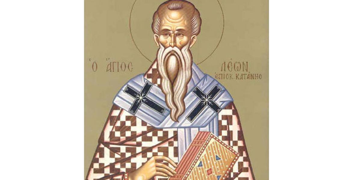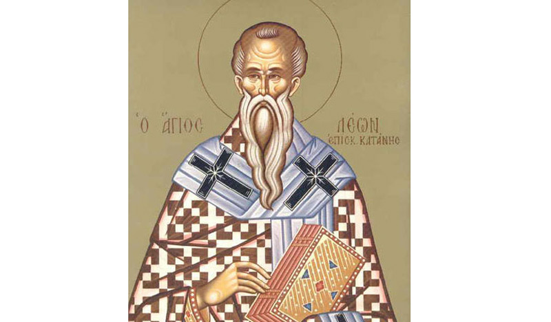 Sfântul Leon, Episcopul Cataniei, a trăit în timpul împăratului Heraclie (641-668 d.H.). Episcop al Cataniei, din Insula Sicilia, Leon se îngrijea neîncetat de săraci şi de bolnavi. La acea vreme, şi-a făcut apariţia în Catania vrăjitorul Eliodor, care înşela poporul cu diferite închipuiri. Acesta a fost prezent şi la Sfânta Liturghie, unde a făcut diverse vrăji. În urma acestor fapte strigătoare la cer, Sfântul Leon l-a legat cu unul din capetele omoforului său şi l-a dus în piaţa oraşului.
