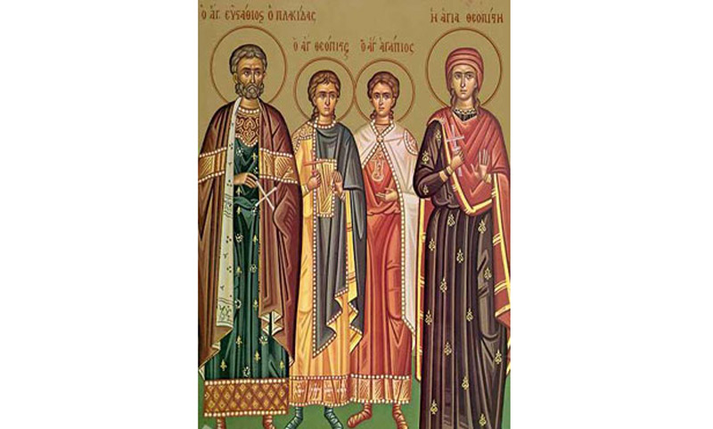 Sfântul Mare Mucenic Eustaţie a fost general al armatei romane în vremea împăratului Traian (98-117 d.H.). Înainte de a primi botezul creştin, se numea Placid. Într-o zi, aflându-se la vânătoare, Eustaţie a gonit un cerb, fiind la un pas să-l răpună. Prin descoperire dumnezeiască, generalul a văzut între coarnele cerbului cinstita Cruce a Mântuitorului Iisus Hristos şi a auzit un glas: “Placide, pentru ce Mă prigoneşti? Eu sunt Hristos, pe Care tu Îl cinsteşti fără să ştii prin lucrările tale cele bune”. La puţin timp după această minune, Placid împreună cu soţia şi copiii s-au botezat în religia creştină. La botez, generalul a primit numele de Eustaţie, soţia sa s-a numit Teopista, iar cei doi fii Agapie şi Teopist.