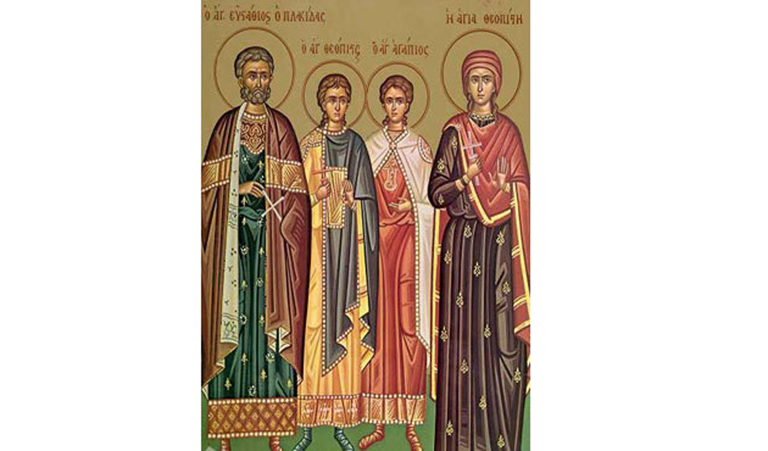Sfântul Mare Mucenic Eustaţie a fost general al armatei romane în vremea împăratului Traian (98-117 d.H.). Înainte de a primi botezul creştin, se numea Placid. Într-o zi, aflându-se la vânătoare, Eustaţie a gonit un cerb, fiind la un pas să-l răpună. Prin descoperire dumnezeiască, generalul a văzut între coarnele cerbului cinstita Cruce a Mântuitorului Iisus Hristos şi a auzit un glas: “Placide, pentru ce Mă prigoneşti? Eu sunt Hristos, pe Care tu Îl cinsteşti fără să ştii prin lucrările tale cele bune”. La puţin timp după această minune, Placid împreună cu soţia şi copiii s-au botezat în religia creştină. La botez, generalul a primit numele de Eustaţie, soţia sa s-a numit Teopista, iar cei doi fii Agapie şi Teopist.