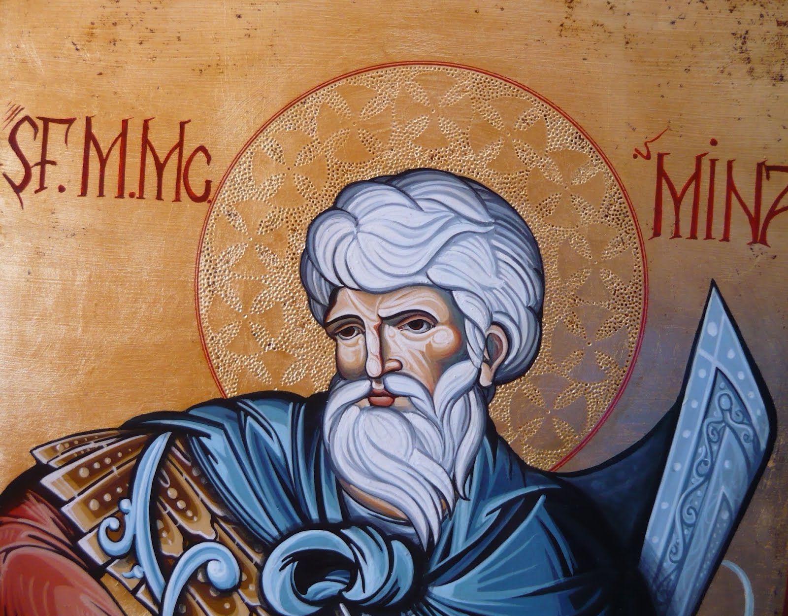 Sfântul Mare Mucenic Mina s-a născut în Nakiyos (în apropiere de Memphis), în secolul III d.H. A rămas orfan pe când era copil: tatăl i-a murit când avea 11 ani, iar mama la trei ani după acesta.