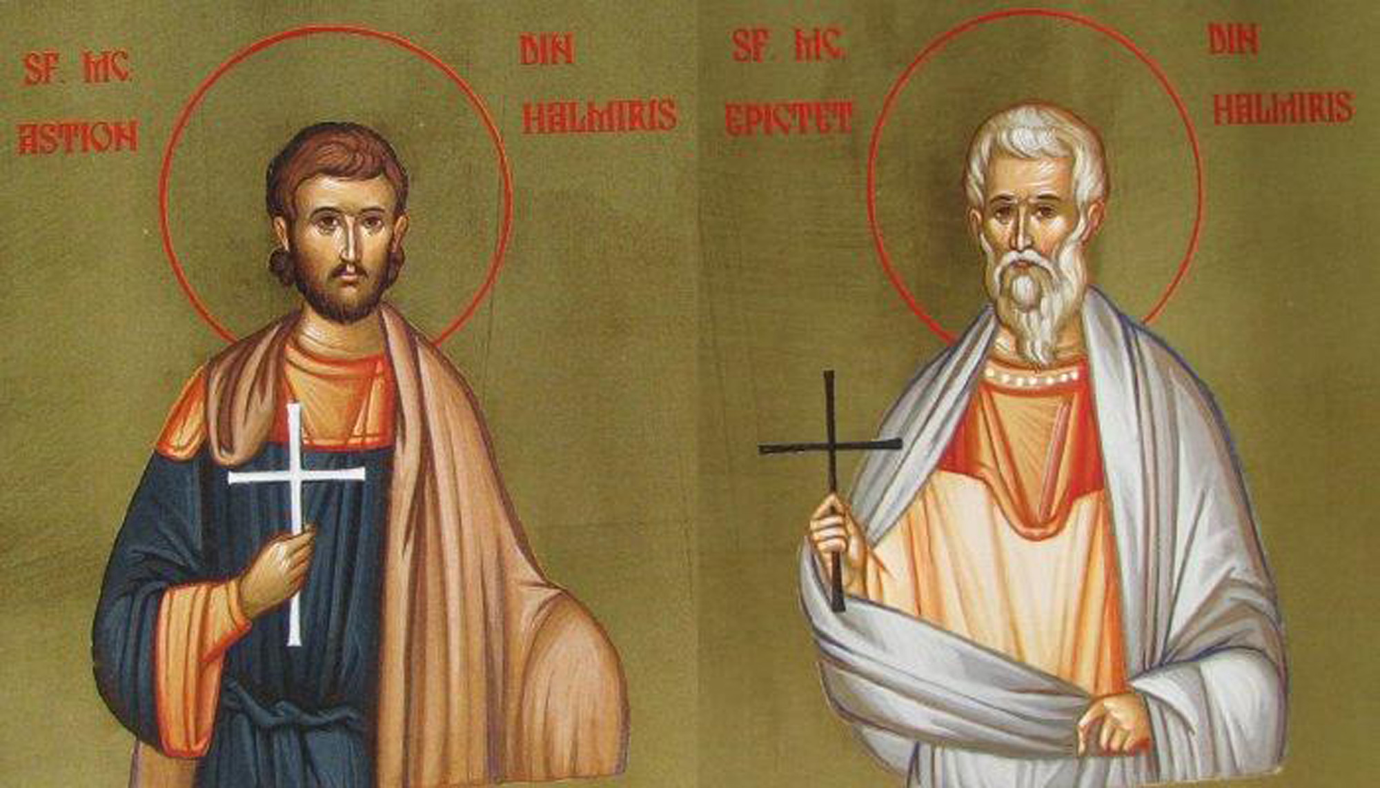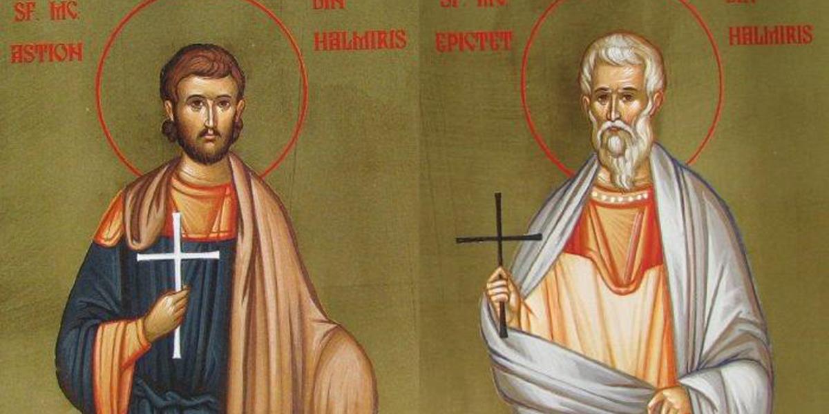 Potrivit documentelor creştine, Sfântul Epictet era originar din părţile Răsăritului. El a primit harul preoţiei şi s-a învrednicit de darul vindecării orbilor, ologilor şi celor demonizaţi. Sfântul Astion era nepotul senatorului roman Iulian. S-a convertit la creştinism după întâlnirea cu preotul Epictet şi, împreună cu acesta, a ajuns în cetatea Halmyris. Mai târziu, şi Astion s-a învrednicit cu darul facerii de minuni, tămăduind un îndrăcit şi vindecând un om care căzuse de la înălţime şi rămăsese aproape mort.