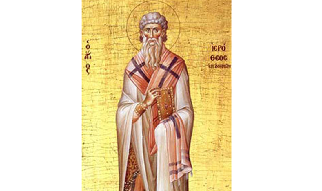 Sfântul Mucenic Ierotei, episcopul Atenei, a primit credinţa în Domnul Iisus Hristos de la însuşi Sfântul Apostol Pavel, Apostolul Neamurilor. El a fost însoţitorul şi ajutătorul Sfântului Dionisie Areopagitul în călătoriile sale misionare. Sfântul Ierotei a fost, de asemenea, primul episcop al Atenei şi a participat, potrivit tradiţiei, la înmormântarea Maicii Domnului. Sfântul Mucenic Ierotei a trecut la cele veşnice în ziua de 4 octombrie, mărturisindu-L pe Domnul.