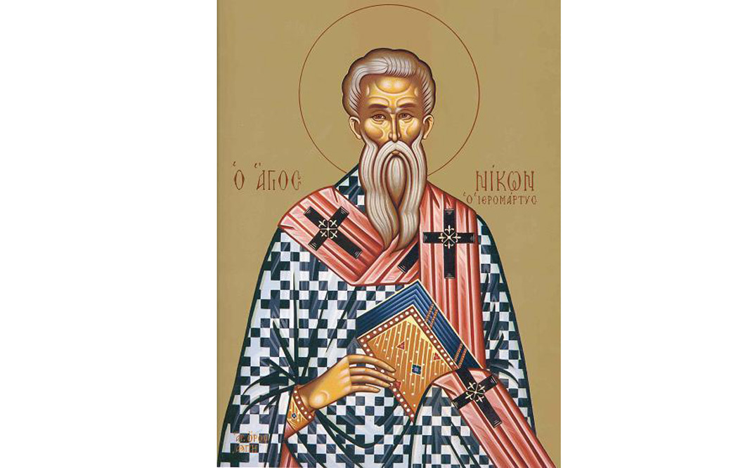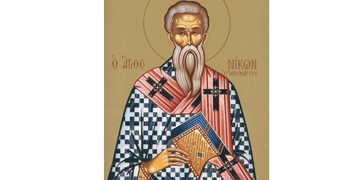 Sfântul Cuvios Mucenic Nicon s-a născut la Neapole, din tată păgân şi mamă creştină. A fost ofiţer în armata romană. Se spune că, în timpul unui aprig război, Sfântul Nicon a făcut semnul Sfintei Cruci şi a rostit tare Numele Lui Hristos, ţinând seama de sfaturile mamei sale. În acel moment, a simţit în el o putere neobişnuită cu ajutorul căreia a reuşit să-i alunge pe duşmani. După război, Nicon a ajuns la Cizic, unde a primit botezul din mâna Arhiereului Teodosie, episcopul creştin al locului. După ce a devenit creştin, s-a retras într-o mănăstire unde s-a dedicat cu totul studiului şi ascezei. La trei ani de la botez, Sfântul Nicon a fost hirotonit preot, apoi episcop.