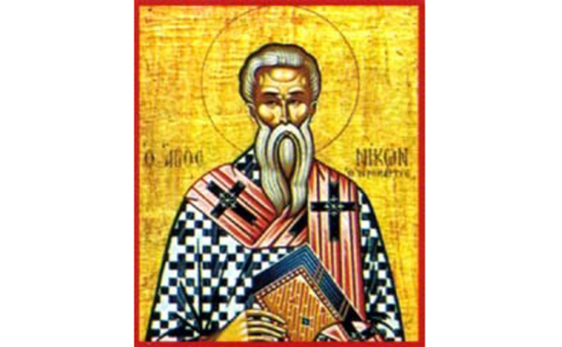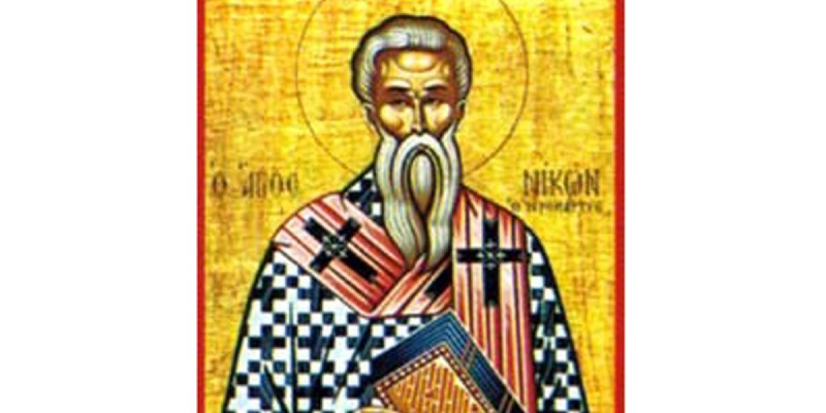 Sfântul Cuvios Mucenic Nicon s-a născut la Neapole, din tată păgân şi mamă creştină. A fost ofiţer în armata romană. Se spune că, în timpul unui aprig război, Sfântul Nicon a făcut semnul Sfintei Cruci şi a rostit tare Numele Lui Hristos, ţinând seama de sfaturile mamei sale. În acel moment, a simţit în el o putere neobişnuită cu ajutorul căreia a reuşit să-i alunge pe duşmani. După război, Nicon a ajuns la Cizic, unde a primit botezul din mâna Arhiereului Teodosie, episcopul creştin al locului. După ce a devenit creştin, s-a retras într-o mănăstire unde s-a dedicat cu totul studiului şi ascezei. La trei ani de la botez, Sfântul Nicon a fost hirotonit preot, apoi episcop.