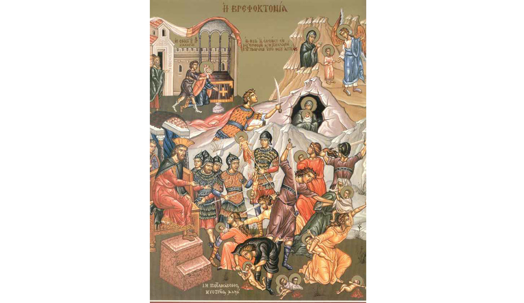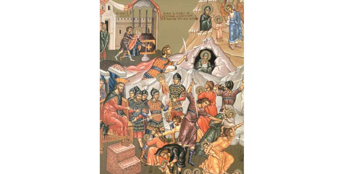 La vremea aceea, mergând cei trei Magi de la Răsărit în Betleemul Iudeii, să se închine Lui Hristos, nu s-au mai întors la Ierusalim ca să-l anunţe pe Irod unde se află dumnezeiescul Prunc.  La porunca îngerului Lui Dumnezeu, Magii de la Răsărit s-au întors cu pace în ţara lor, urmând o altă cale. Văzând că a fost înşelat de magi, regele Irod s-a mâniat foarte tare şi a poruncit uciderea tuturor pruncilor de parte bărbătească din Beleemul Iudeii şi din împrejurimi, gândind că, astfel, îl va ucide pe noul Împărat.  Astfel, s-a împlinit proorocia: Glas se aude în Rama, bocet şi plângere amară. Rahila îşi plânge copiii” (Proorocul Ieremia 31: 15; Evanghelia după Matei 2: 18).