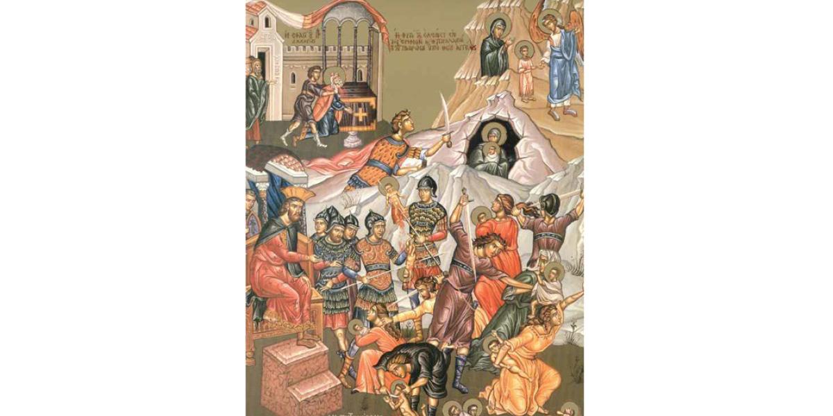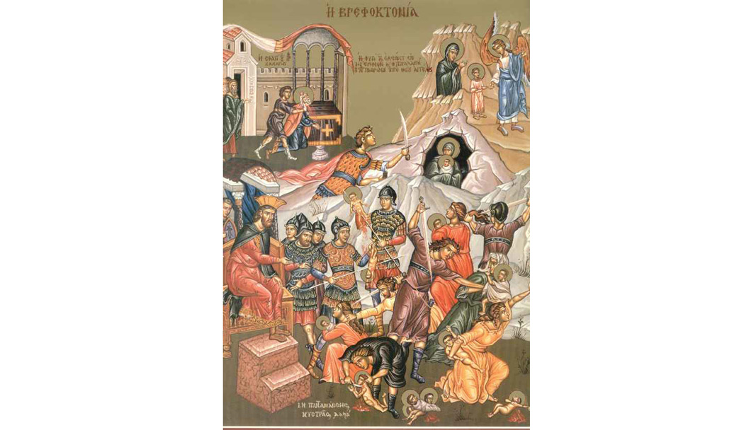 La vremea aceea, mergând cei trei Magi de la Răsărit în Betleemul Iudeii, să se închine Lui Hristos, nu s-au mai întors la Ierusalim ca să-l anunţe pe Irod unde se află dumnezeiescul Prunc.  La porunca îngerului Lui Dumnezeu, Magii de la Răsărit s-au întors cu pace în ţara lor, urmând o altă cale. Văzând că a fost înşelat de magi, regele Irod s-a mâniat foarte tare şi a poruncit uciderea tuturor pruncilor de parte bărbătească din Beleemul Iudeii şi din împrejurimi, gândind că, astfel, îl va ucide pe noul Împărat.  Astfel, s-a împlinit proorocia: Glas se aude în Rama, bocet şi plângere amară. Rahila îşi plânge copiii” (Proorocul Ieremia 31: 15; Evanghelia după Matei 2: 18).