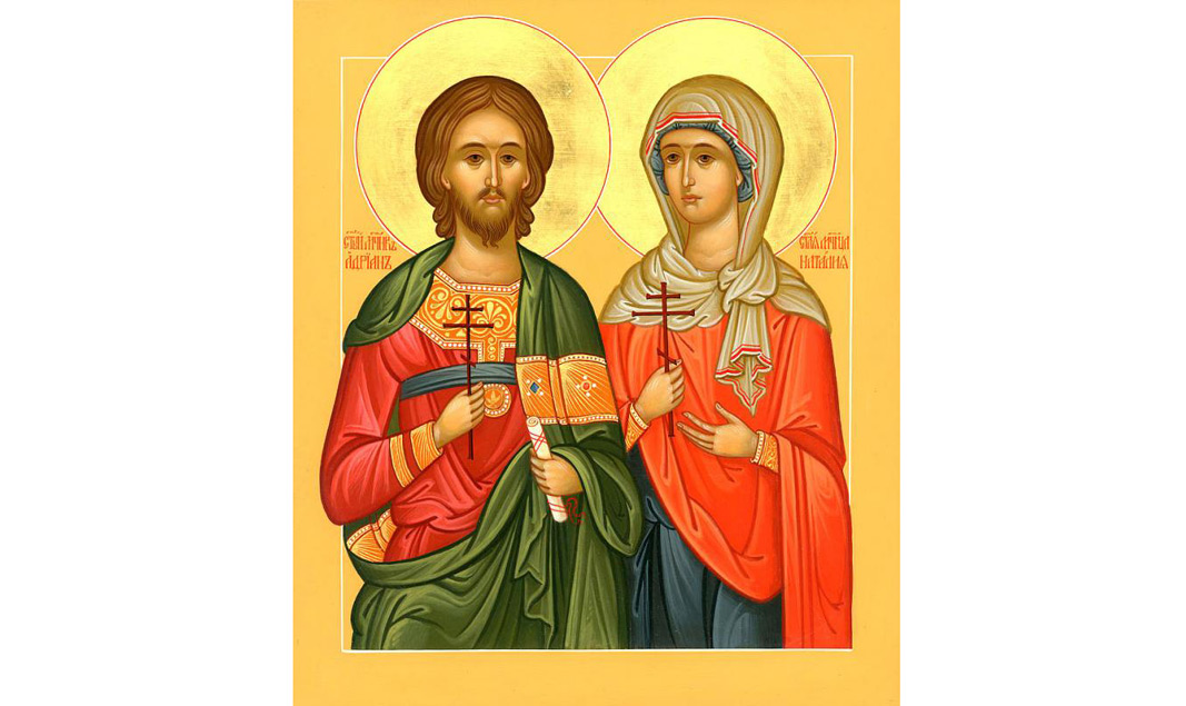 Sfinţii Adrian şi Natalia, soţ şi soţie, au trăit în Nicomidia, în vremea împăratului Maximian. Sunt prăznuiţi pe 26 august. Adrian era păgân şi pretor al Nicomidiei, iar Natalia era creştină. În timpul unei persecuţii, văzând curajul şi blândeţea a 23 de bărbaţi creştini, Adrian, un tânăr de 28 de ani, a ales să devină creştin.