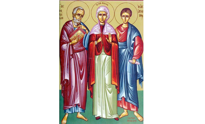Sfinţii Apostoli Arhip, Filimon şi soţia sa, Apfia, au trăit şi au pătimit pentru Hristos în vremea sângerosului împărat roman Nero. Sfântul Apostol Arhip a fost episcop în marea cetate Colose, din provincia Frigia. Sfântul Apostol Filimon a fost convertit la creştinism de însuşi Sfântul Apostol Pavel şi în casa lui se adunau creştinii pentru a participa la rugăciunea comună şi pentru a-i aduce slavă Lui Dumnezeu. Sfânta Apfia, soţia Apostolului Filimon, rânduia biserica din casa ei.