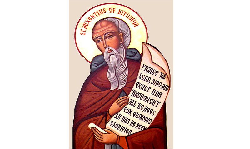 Sfântul Cuvios Auxenţiu a fost dregător la curtea împăratului bizantin Teodosie cel Mic. El a îmbrăcat haina monahală şi a părăsit Constantinopolul, stabilindu-se pe un munte, lângă cetatea Calcedon (care, mai târziu, avea să se numească “Muntele lui Auxenţiu”). Dorinţa sa fierbinte era aceea de a rămâne ascuns de ochii oamenilor, pentru a se desăvârşi prin rugăciune şi nevoinţă, însă nişte păstori l-au descoperit, spunându-le apoi şi locuitorilor din satele învecinate despre viaţa sfântă a cuviosului. Şi astfel, oamenii au început să-l caute pe Sfântul Auxenţiu, aducându-i bolnavi pentru a-i vindeca.