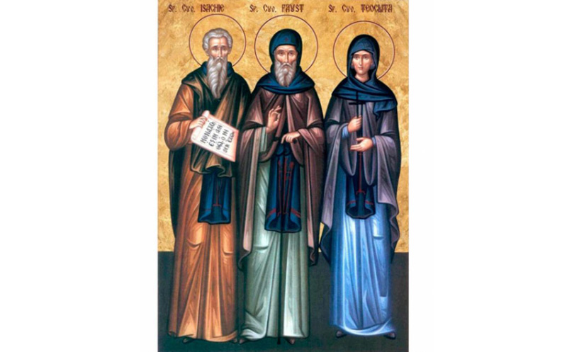 Sfântul Cuvios Isaachie este cinstit aparte în fiecare an, pe data de 30 mai. Este sfântul care a luptat pentru înapoierea bisericilor ortodoxe luate de ereticii arieni, cu sprijinul mai-marilor imperiului. Înainte de a trece la cele veşnice, Sfântul Isaachie l-a numit stareţ pe ucenicul său, Dalmat. Acesta a fost ostaş în armata imperială a împăratului Teodosie cel Mare. Dalmat şi-a părăsit cariera militară, soţia şi copiii şi a vieţuit apoi în obştea Cuviosului Isaachie, împreună cu fiul său, Faust. Dalmat s-a dat pe sine unei aspre postiri, astfel încât ajungea să nu mănânce nimic timp de 40 de zile încheiate. A fost unul din părinţii Bisericii Creştine prezenţi la al III-lea Sinod Ecumenic al creştinătăţii, ţinut în anul 431 d.H., în marea cetate a Efesului. Acolo, s-a ridicat împotriva învăţăturii lui Nestorie, care susţinea că Fecioara Maria este născătoare numai de om, nu şi de Dumnezeu. Faust, fiul lui Dalmat, i-a fost sprijin în toate tatălui său. El a trecut la cele veşnice în aceeaşi obşte monahală în care a intrat împreună cu Dalmat.