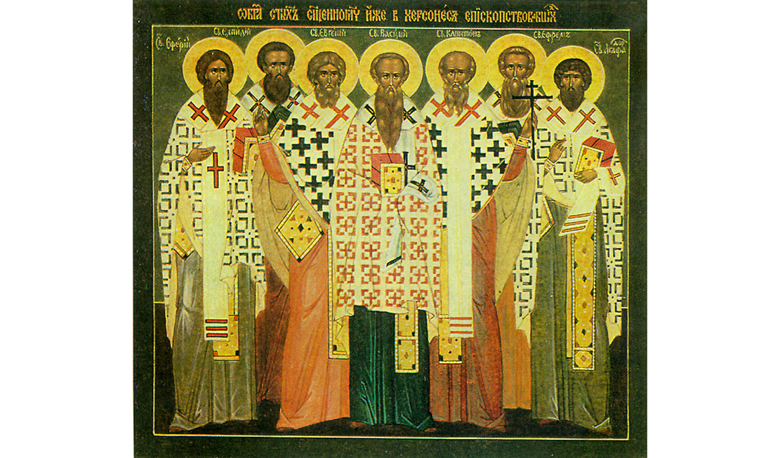 Sfinţii Mucenici Vasilevs, Efrem, Evghenie, Capiton, Eterie, Agatodor şi Elpidie au fost episcopi ai Chersonului, în ani diferiţi. Toţi au fost trimişi de către Patriarhul Ierusalimului ca misionari în acele ţinuturi păgâne, ca să aducă lumina Evangheliei. Ei au sfârşit prin a-l proslăvi pe Hristos, fiind martirizaţi, ucişi de mâinile necredincioşilor evrei, greci şi sciţi. După ce, plin de credinţă, Vasilevs l-a înviat pe copilul conducătorului din Cherson, a fost ucis de păgâni. Iar după moartea sa, au venit în Cherson episcopii Evghenie, Agatodor şi Elpidie. Şi aceştia au fost ucişi de păgâni, tot în ziua a şaptea a lunii martie. Efrem a fost omorât prin decapitare. Episcopul Eterie a cerut ajutor de la împăratul Constantin cel Mare şi a reuşit să-i alunge pe păgâni, dar a fost omorât pe când mergea la Bizanţ, ca să-i mulţumească impăratului pentru ajutor.
