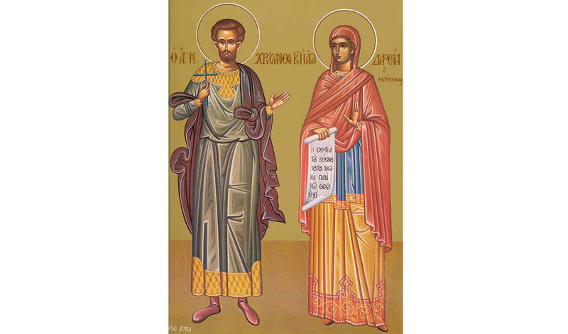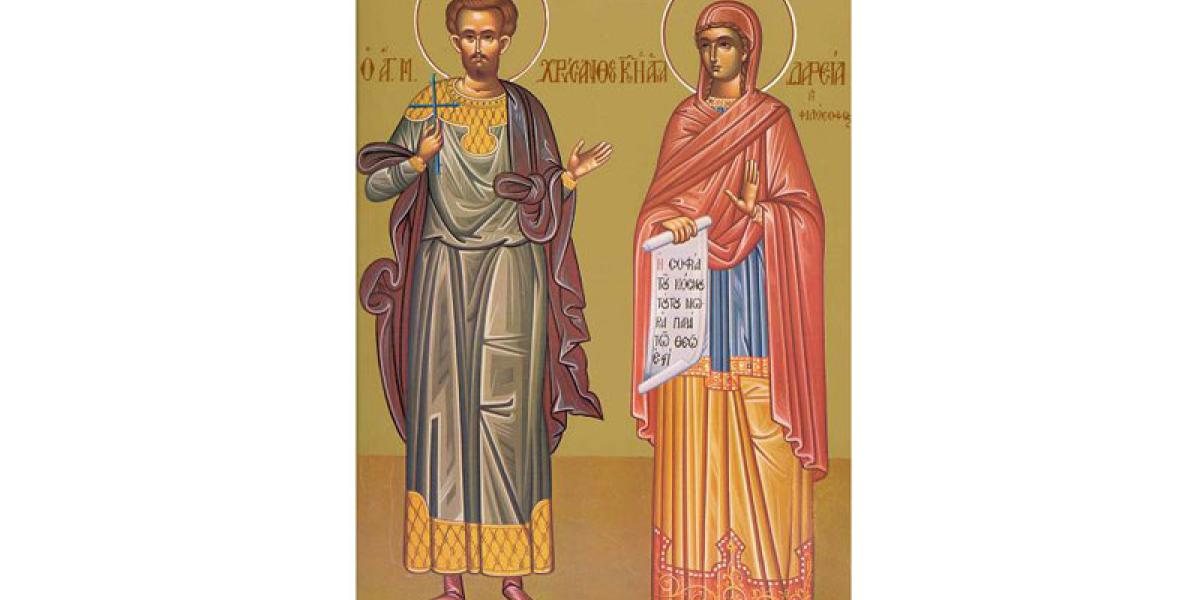 Sfântul Mucenic Hrisant a fost fiul lui Polemius, un distins patrician roman. A trăit în secolul al III-lea d.H. Se spune că, după ce a citit Faptele Apostolilor, Hrisant a ales să fie botezat în religia creştină. Închinător la zei, Polemius a făcut tot ce i-a stat în putere pentru ca Hrisant să lepede credinţa în Hristos. După nenumărate încercări, patricianul şi-a silit fiul să o ia în căsătorie pe Daria, o tânără de neam ales, sperând că va jertfi iarăşi zeilor. Plin de râvnă, Hrisant i-a aprins şi Dariei dorul după Hristos.