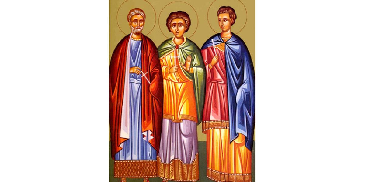 Sfinţii Mucenici Mina, Ermoghen şi Evgraf au trăit la sfârşitul secolului al III-lea - începutul sec. al IV-lea de la Hristos. Mina şi Ermoghen s-au născut la Atena, însă au locuit în Bizanţ, aflându-se în slujba împăratului păgân Maximian. Vestit pentru învăţătura sa şi pentru darul elocinţei, Mina a fost trimis de către împărat în Alexandria, pentru a restabili liniştea oraşului. El a restabilit cu adevărat ordinea, dar pe creştini i-a lăsat în pace, declarându-se, la rândul său, creştin. Aflând despre ceea ce s-a întâmplat în cetatea Alexandriei, împăratul l-a trimis pe prefectul Ermoghen să-l convingă pe Mina să renunţe la credinţă şi să-i persecute pe creştini.