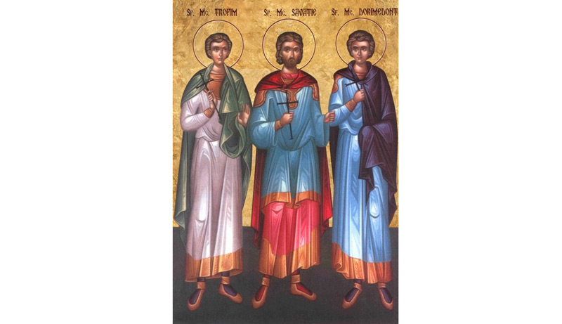 Sfinţii Mucenici Trofim, Savatie şi Dorimedont, pe care îi cinstim astăzi, au trăit şi au pătimit pentru Hristos în timpul împăratului roman Probus (276-282 d.H.), care i-a persecutat, ca atâţia alţii, pe mărturisitorii creştini. La acea vreme, creştinii Trofim, Savatie şi Dorimedont au sosit în marea cetate a Antiohiei, în toiul unui mare festival păgân, când se aduceau jertfe zeului Apollo. Pentru că nu au participat la aducerea jertfelor, credincioşii au fost judecaţi, torturaţi şi aruncaţi în temniţă. Mai apoi, Trofim şi Dorimedont au fost decapitaţi, iar Savatie şi-a dat duhul pe când era închis în temniţă. Aşa L-au proslăvit cei trei sfinţi mucenici pe Domnul Dumnezeu.